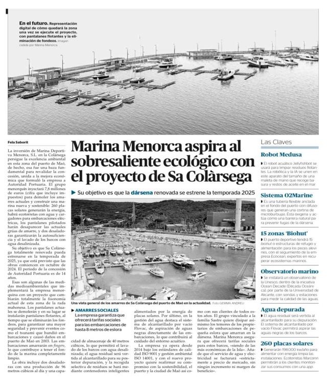 La inversión de Marina Deportiva Menorca, S.L. en la Colàrsega persigue la excelencia ambiental en esta zona del puerto de Maó, de hecho, esa fue una baza fundamental para revalidar la concesión, unida a la mejora económica que formuló la empresa a Autoridad Portuaria.